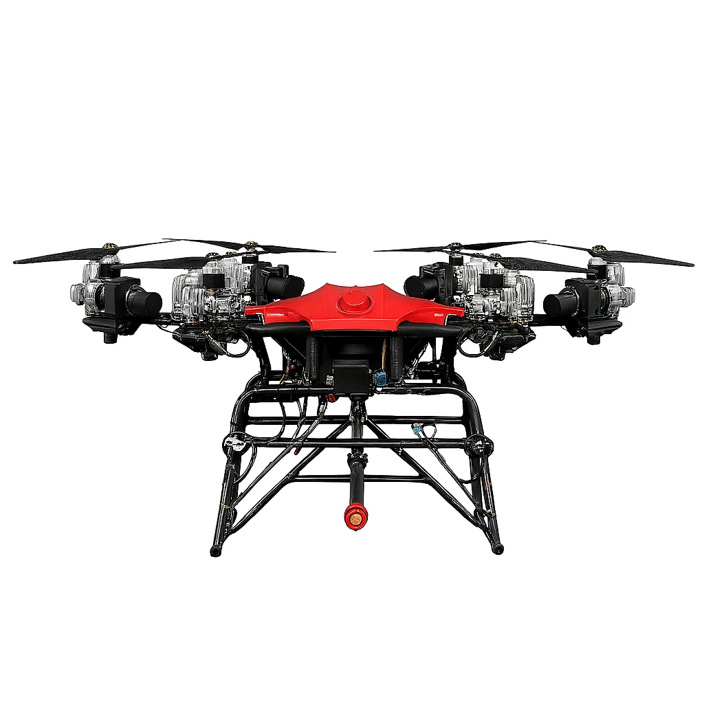 The Horizontal Fire Suppression Drone is designed for precision suppression tasks where conventional aerial-drop UAVs cannot achieve direct line-of-sight access. Its core architecture centers on a servo-guided launch module capable of discharging up to four 25 kg suppression projectiles horizontally, enabling targeted delivery into sealed environments where fires may accelerate rapidly due to heat buildup, ventilation blockage, or structural constraints. Each projectile can contain dry chemical or liquid extinguishing agents formulated for Class A or Class B hazards, and the reinforced launch tubes deliver calibrated velocity sufficient to penetrate up to 12 mm of tempered glass so the agent can reach ignition points inside closed rooms or industrial enclosures. The drone integrates thermal-signature tracking alongside near-infrared life-signal detection to identify fire zones while automatically avoiding areas with detected human bio-signals, reducing the risk of accidental impact during semi-autonomous missions.