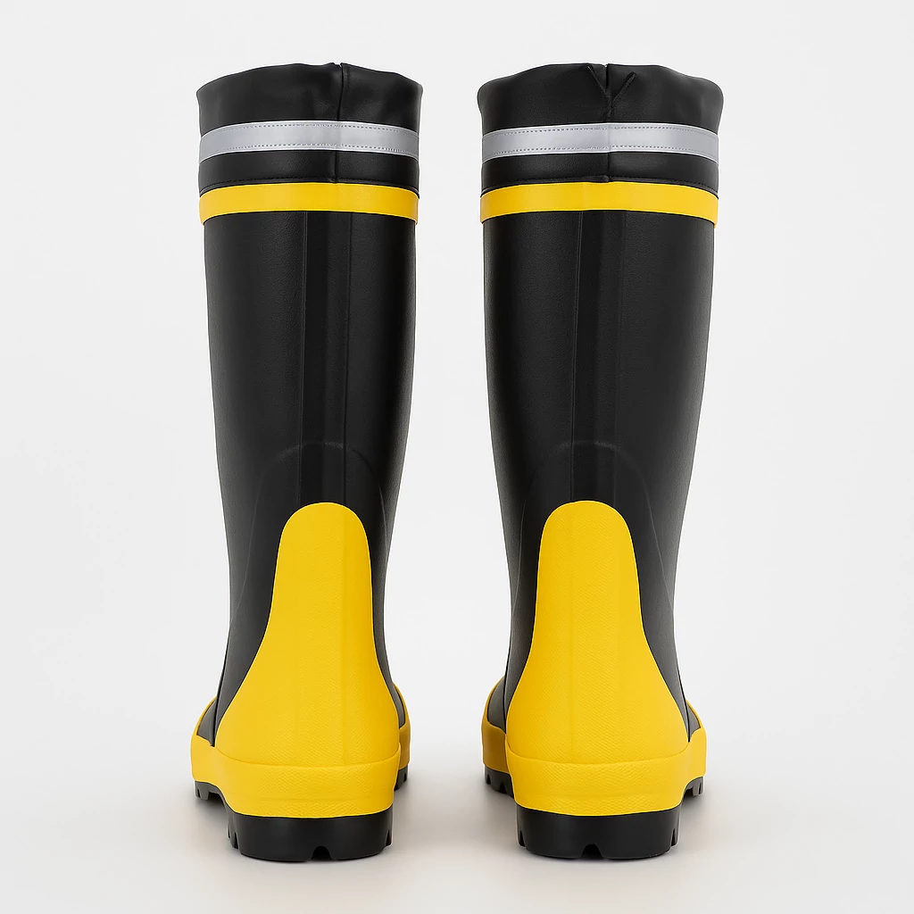 For underfoot safety, a Kevlar or steel puncture-resistant midsole achieves ≥2800 N (≈630 lbf) penetration resistance. Internally, a 5 mm polyester felt liner with heel reinforcement supports long hours of wear, while a cushioned shin guard improves comfort when climbing ladders. A removable PU insole absorbs shock during extended shifts.