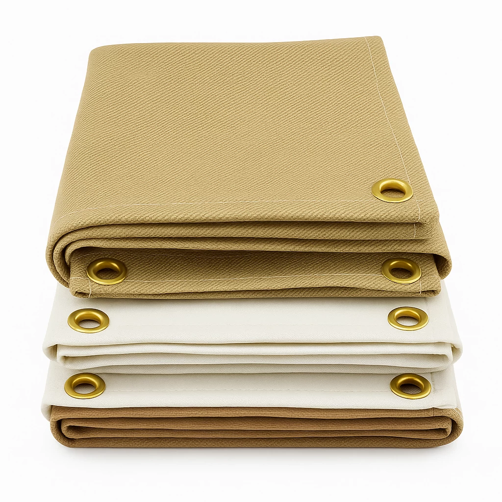 Each fireproof welding blanket is reinforced with para-aramid (Kevlar®-equivalent) stitching and fitted with nickel-plated or stainless-steel grommets (15 mm Ø every 24–36 in / 610–914 mm) for secure installation. Available as pre-cut sheets or rolls, they integrate seamlessly with other flame retardant fire blankets, curtains, or welding enclosures.