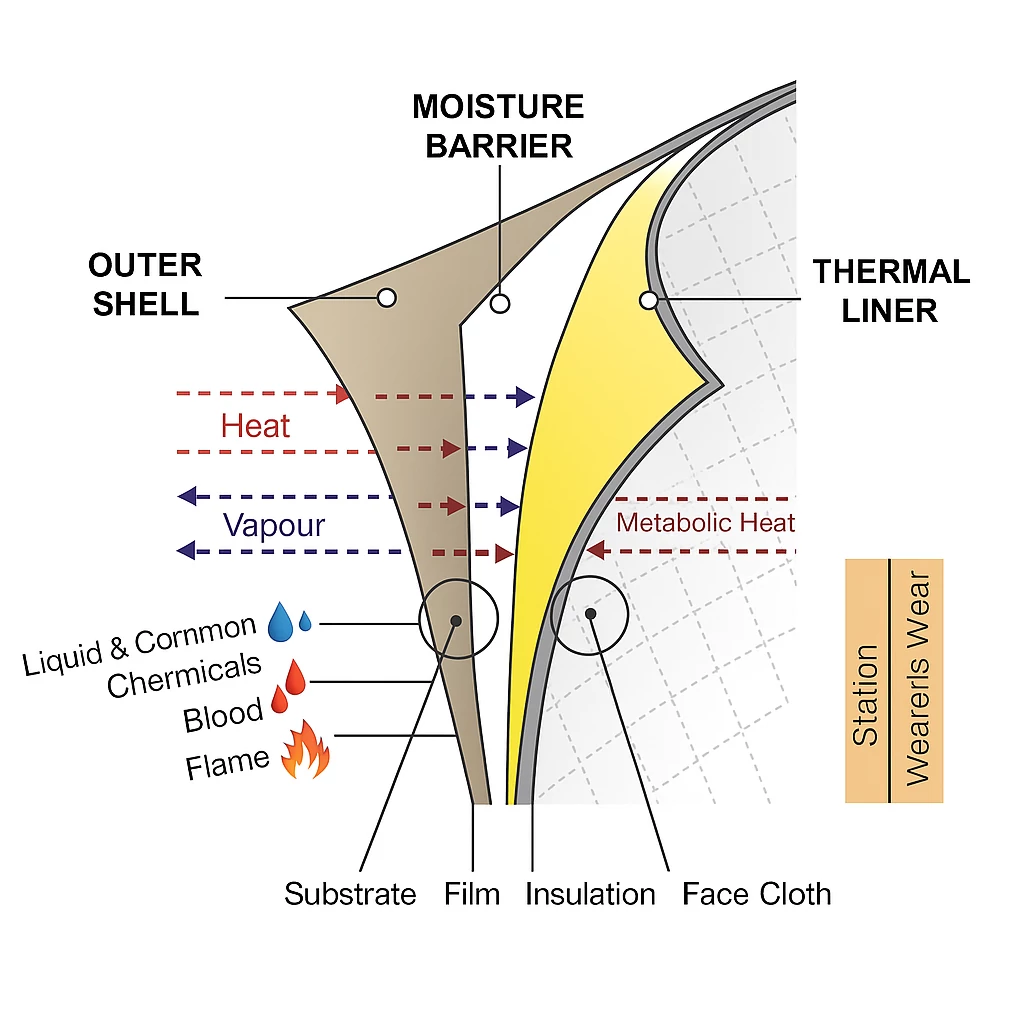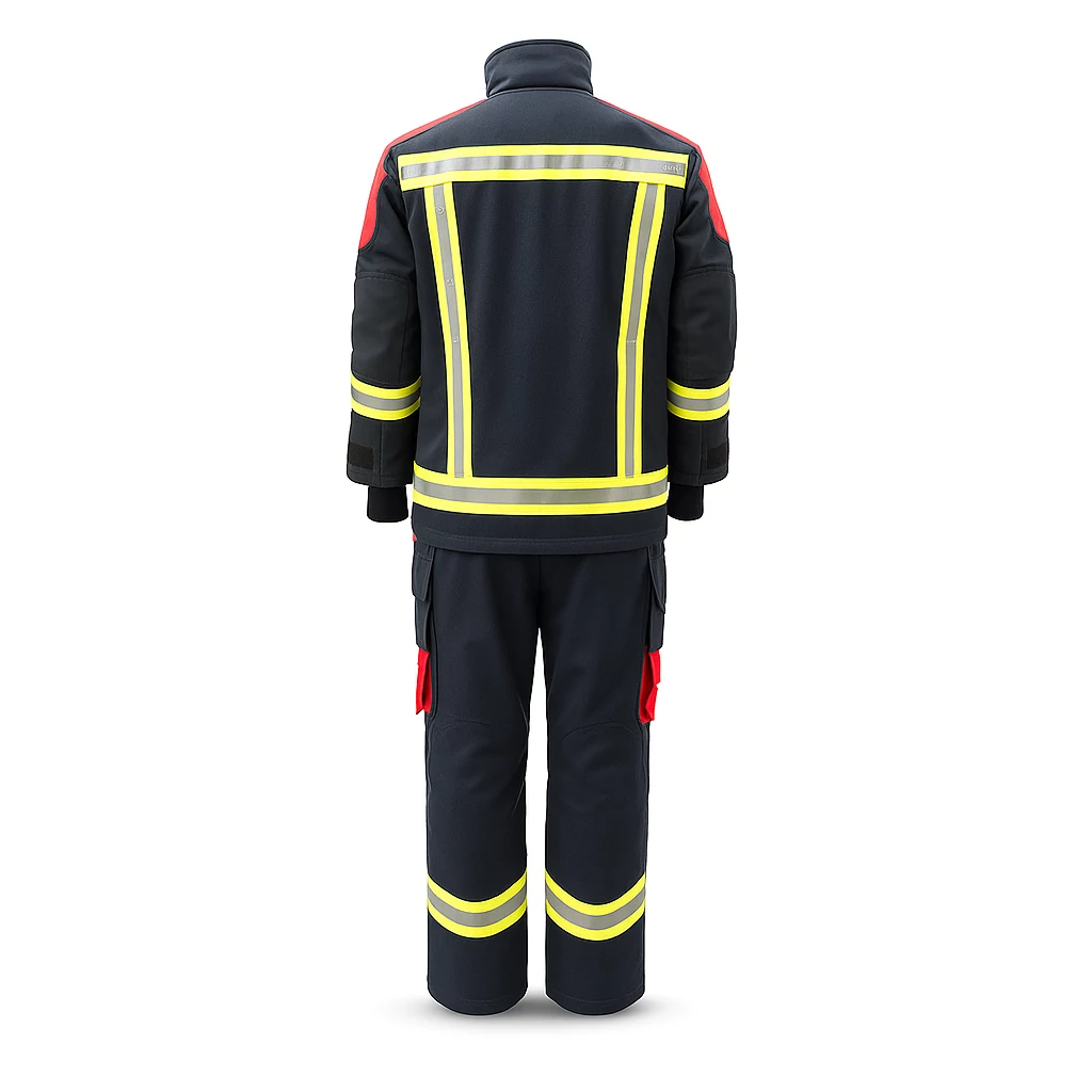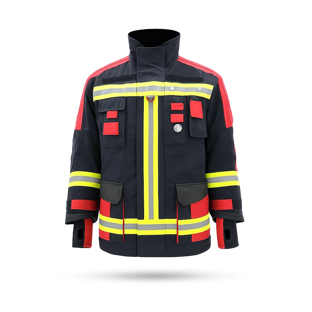 For visibility during smoke, dusk, or night ops, the garment uses 3M Scotchlite™ reflective trim. For seasonal operations, an optional thermal liner can be integrated without compromising breathability.